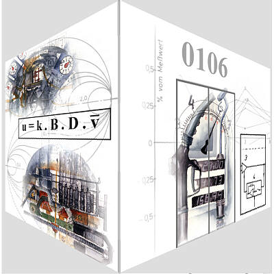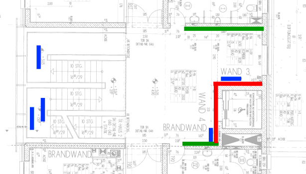 1. Stock: Links Wandabwicklung     Mitte: Ebenen  E1 +3 + 5, E2, E4      Rechts: Perspektive